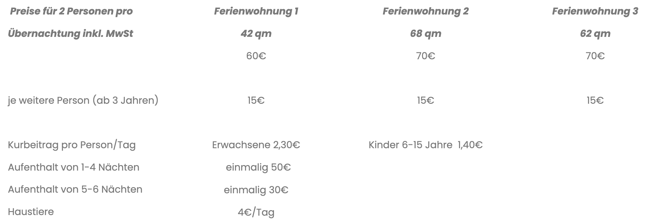 In den Preisen sind folgende Leistungen enthalten: